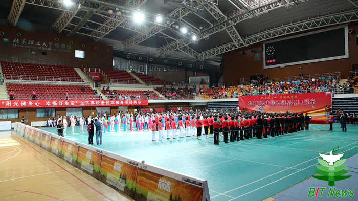 本次健身项目展示活动中有来自北京地区22所高校和北京教育老干部活动中心的23支代表队800余位离退休老同志参加,所展示的老同志健身活动形式多样,涵盖健身操、太极拳、扇子舞、交谊舞、广场舞等。老同志们精神矍铄,盛装华服,载歌载舞,展示活动精彩纷呈、高潮迭起,活动现场掌声不断。我校老年健身队在离退休工作处的组织下,经过为期一个月的辛苦排练,打造出既时尚流行又强身健体的广场舞《最酷小苹果》,赢得了现场评委和观众们的好评,展现了我校老同志的昂扬的精神风貌。