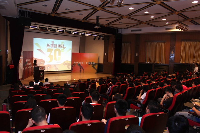 活动现场,四名学生为大家深情朗诵《致燕京新闻社》,表达了对作为一名燕京新闻社成员的自豪以及对其未来的美好憧憬。社庆庆典活动中,举办了第三十届“脚步征文”颁奖仪式,蔺伟为获奖学生颁发了证书和奖品。作为社庆活动的一部分,燕京新闻社在七号楼一层大厅举办了主题新闻展,围绕“新闻”的发展与“校园新闻”的发展,展现了北京高校新闻类社团的风雨历程。