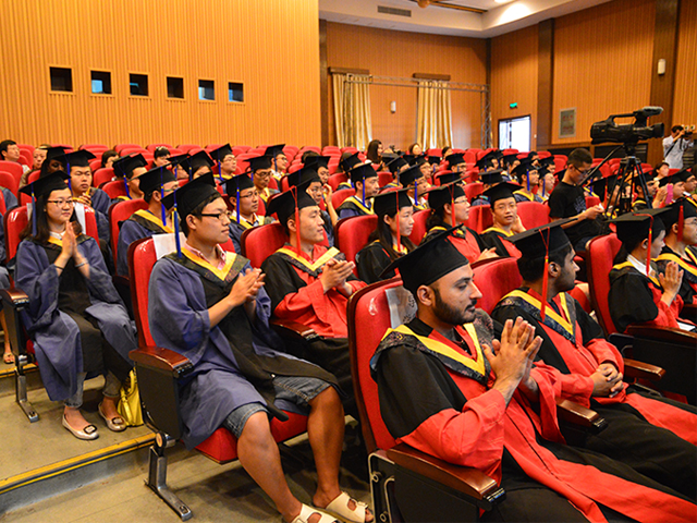 最后,黄河燕院长代表学院在典礼上致词,对顺利完成学业并即将踏上新的人生征途的2015届毕业生表示热烈的祝贺,向为此辛勤付出的教职员工和亲友表示感谢。在大家扬帆起航之际,黄院长强调最多的是“担当”与“责任”。 “士不可不弘毅,任重而道远”,结束研究生学习,标志着毕业生们系统地接受了高等教育;而走上社会之后,黄院长勉励大家要时刻牢记自己肩负的责任,这包括对自己的责任、对家庭的责任以及对社会、对国家的责任。“人所能担的责,我必能担;人所不能担的责,我亦能担”,黄院长衷心寄语毕业生,希望大家能将担当贯穿于生活和工作的点点滴滴。最后,黄院长代表学院表达了对所有毕业生最诚挚的祝福。