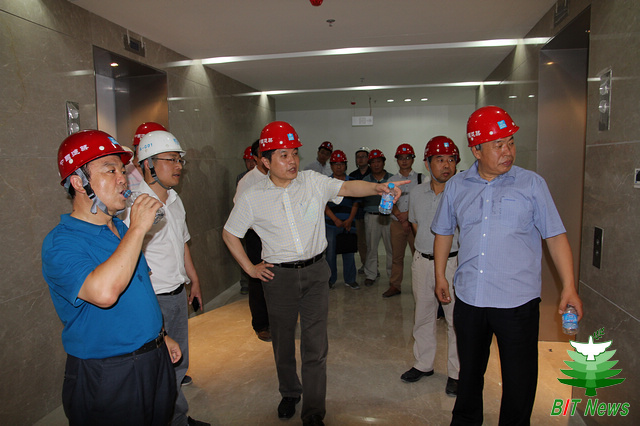 胡校长一行来到工地后,首先听取了资产经营公司和参建单位负责人关于工程建设进展情况汇报,之后,胡校长一行先后来到A栋、D栋、E栋楼视察了建成后的电梯厅、卫生间等样板间(层)。在视察过程中,胡校长、杨宾常务副校长、杨树兴副校长、李和章副校长就电梯厅、卫生间的设计风格、灯光照明,以及墙地面石材的选择、卫生洁具的选配等与在场的资产经营公司及承建单位、监理单位、项目部等有关单位负责人和工程技术人员进行了交流并提出了调整改进意见。