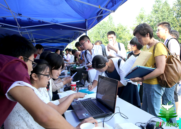 六点开始,迎新工作正式启动,新生和家长陆续到校。主迎新站设置在良乡校区行政楼广场,各迎新学院按照专业设置了迎新站,并组织安排高年级学生担任迎新志愿者,在校内为报到新生提供服务。