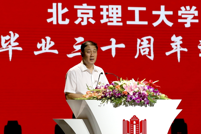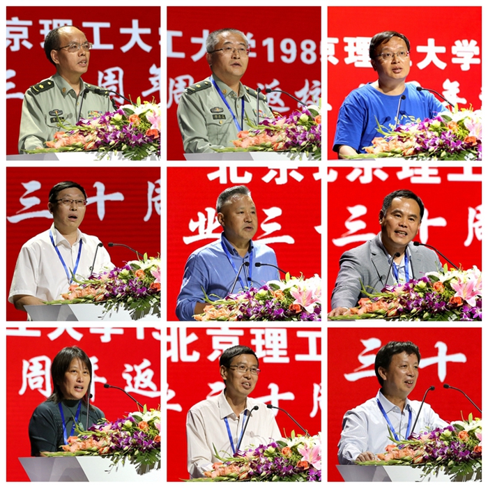 第二炮兵装备研究院副总师、16811班麻永平校友,军事交通学院教授、22811班苏欣平校友,国家发展改革委经济与国防协调发展司司长、 32811班王树年校友,九城网络技术集团有限公司CEO、42811班王双校友,电子科技大学集成电路研究中心主任、教授、博导,成都十大杰出青年、54811班张波校友,技源科技(中国)有限公司董事长兼CEO、62811班周京石校友,机科发展科技股份有限公司自动检测与装备事业部总经理、全国劳动模范、73811班李芳校友,中国工程物理研究院流体物理研究所核专家、四川省劳动模范、84811班谷岩校友,北京同有飞骥科技股份有限公司董事长、92812班周泽湘,共9位校友分别代表军队系统、政府部门、民营企业、科研领域的校友发言。麻永平在发言中诚挚地感恩母校及教师们30年前的栽培,以及30年后给1985届校友提供了一个团聚的平台。苏欣平感慨到光阴似箭,三十年来,无论身居何职,1985届校友都牵挂母校发展,未来也将一如既往地关注支持母校,用赤子深情和不懈努力回报母校。王树年谈到作为一名京工学子,会永远铭记自己的人生足迹是从米兰扬帆起航的,无论身在何方,都将心向母校,情系恩师。王双在发言中分享了“他和北理那些事”,讲述了他来米兰求学和创业的故事,以及他参与的帮助在校学生的“芝兰成长基金”设立初衷。张波感叹30年来“亲同学”间的团聚,仿佛自己又回到了学生时代,“母校恩,同学情,任重道远多保重”,祝福母校欣欣向荣,蓬勃发展。周京石回忆了在校期间的学霸生活及创业之路,感恩母校在自己人生观、价值观形成中的重要指导,现在所有的成就,都得益于母校在“做人”方面的教导。李芳谈到,三十年忙碌而充实的职业生涯受益于这片校园,由衷得感谢母校的培养,老师的教诲,同学间的相知相伴。谷岩在发言中指出母校带给自己的不仅是学科知识,更重要的是学习、工作的精神,正是这种精神,才能克服工作中的困难,把握机会,继续为国防事业做贡献,为母校争光。周泽湘在发言中指出,现在所有的成就和米兰有解不开的情缘,感谢母校和教师们的谆谆指导。