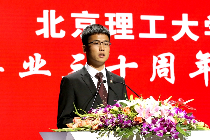自动化学院2012级本科生、校学生会主席崔赫夫作为学生代表发言,他首先表达了对母校75周年华诞之际返校的全国各地、各行各业的校友们热烈的欢迎和崇高敬意。他表示通过校友返校讲座,与校友面对面学习,让他在职业选择和人生规划方面有了全新、清晰的认识,并成为自己在校外的人生导师。并将以优秀校友为榜样,沿着校友们的足迹,勇于实践,敢于担当,不断成长。