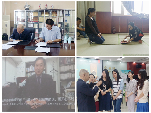 友爱协会的羽中田女士用从日本空运来的榻榻米,横幅和各种茶具搭建了茶室—无境庵,为同学们演示了正统的茶道,并请大家品尝了精致的抹茶和茶点。同行的两位日本大学生川手祥右和高桥佳大也分别就日本的传统建筑和学生就业做了精彩的报告。友爱协会理事长,日本前首相鸠山由纪夫还特意通过视频为理工大日语系学生送来问候。