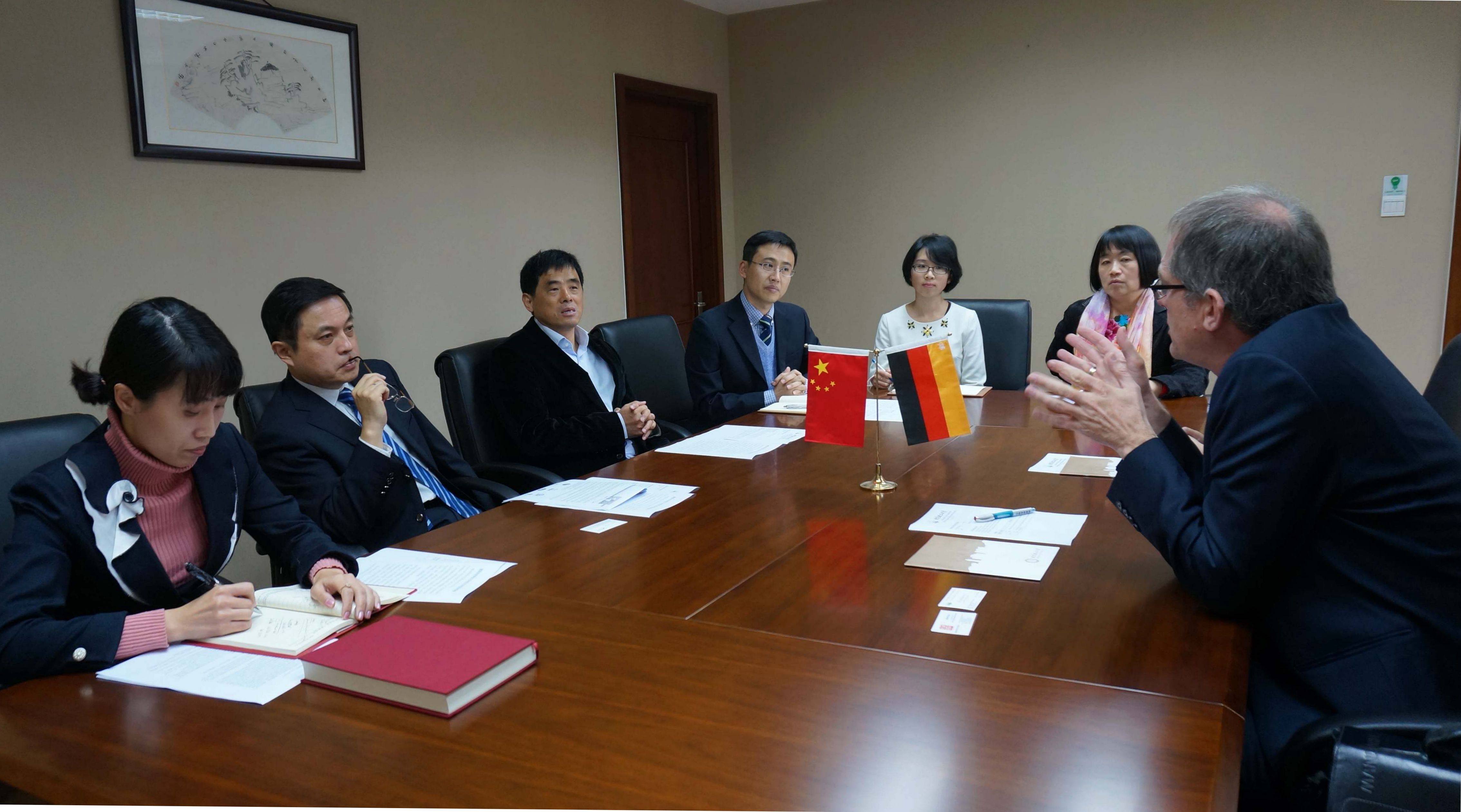 Leible校长感谢胡校长的热情接待。他介绍了拜罗伊特大学的校情和优势学科,并表示,目前两校之间在管理与经济学科的师生交流频繁。拜罗伊特大学将积极推进两校在材料科学、物理、数学等学科的合作项目。