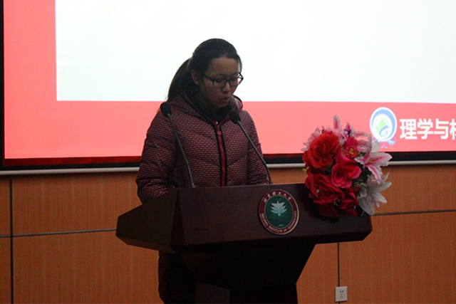 2014级生物工程专业第一——罗惠同学作为获奖学生代表上台发言。她从合理规划时间、重视课堂学习以及参加专业相关科技创新活动三方面向大家分享了大一的收获,并倡议大家要做一个勤奋的大学生,找到自己的目标,并努力为之奋斗。
