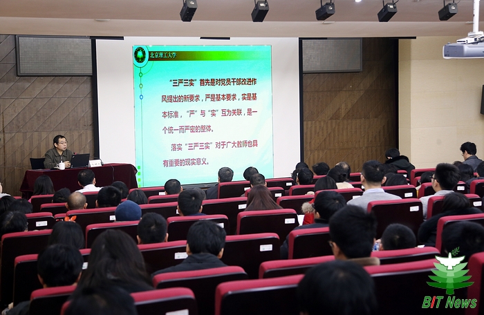 杨树兴立足学校实际,从深刻认识“三严三实”的内涵和重大意义谈起,通过分享“理想教师的八个特质”,以及身边优秀共产党员王越、毛二可、周立伟、韩伯棠、马宝华的先进事迹,指出“三严三实”不仅是对党员干部改进作风提出的要求,对于广大教师也具有重要的现实意义。教师对职责范围内可支配权利的严格使用,对教学研究工作的忠诚务实,直接影响着我校建设世界一流理工大学的进程。杨树兴还为大家讲解了我校在统筹推进“双一流”建设中,为解决制约教师队伍发展问题,制定的人事制度改革方案,具体阐述了人事制度改革的原则、任务以及具体措施,特别就教学科研岗位人事制度新体系进行了说明。党课的最后,杨树兴通过分享自己对现代大学的几点思考,提出中国大学已经入高速竞争的时代,高校教师绝不是一个轻松的职业,希望大家严以修身,传承先进的大学精神和大学文化;忠诚、无私、奉献,谨守规则底线,做严以用权的典范;淡漠名利,乐于奉献,甘为人梯,做严以律己的表率。