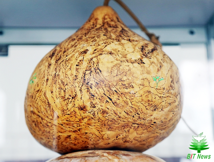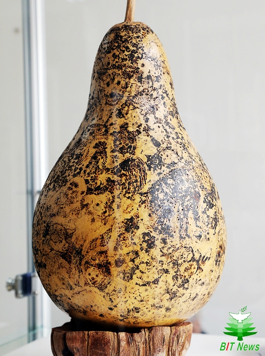 蔡汝震(原设计艺术学院退休教师)、周本相(原校宣传部退休干部)二位老师退休后潜心研究葫芦艺术,通过笔绘、电烙、雕刻、镶嵌等艺术工艺,精心创作了大量展示人民幸福生活,宣传绿色环保理念,充满正能量的艺术作品。