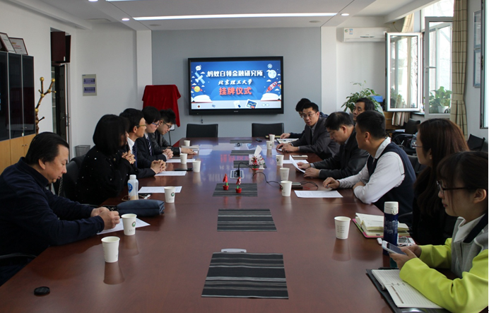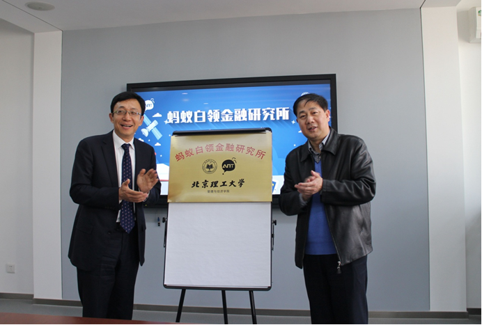 颜志军和王洵代表校企双方共同签署了合作协议,项昌乐和咏岗为 “蚂蚁白领金融研究所”揭牌。