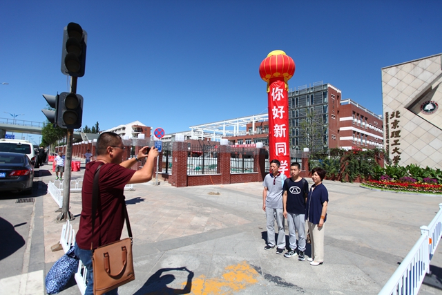 你好,新同学。合影留念后,就要和爸爸妈妈说再见。