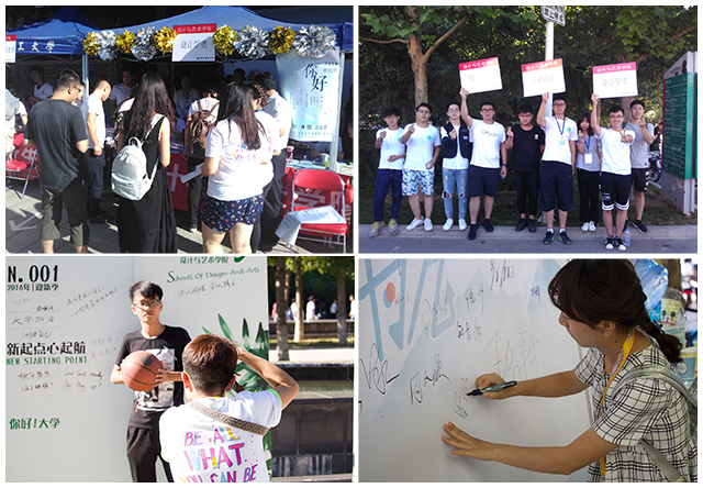 为确保迎新工作有条不紊进行,设计学院提前对高年级迎新志愿者进行了相关培训。迎新志愿者于清晨五点就来到迎新现场,完成迎新站的布置等前期准备工作。六时许,新生陆续到达迎新站完成注册流程,并在棚后的喷绘墙上签名并拍“四年照”留念,为每位新生记录下这一美好的回忆。