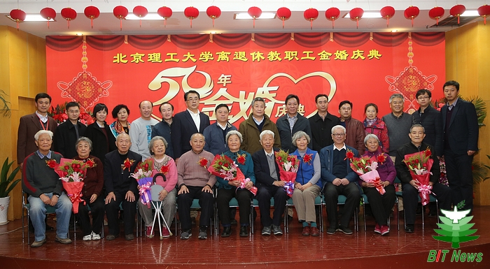 伴着欢快的旋律,学校领导、校离退休工作领导小组成员单位领导、金婚伉俪原单位领导为金婚伉俪赠送了金婚纪念品并合影留念,共同祝愿他们幸福安康、万事如意。
