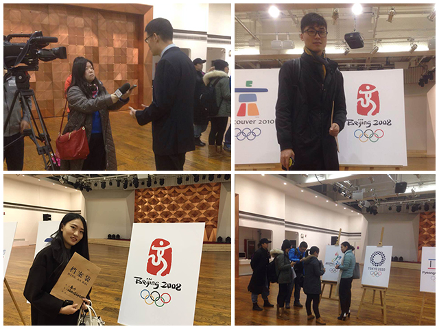 办公室外的展厅里布置了历年奥运会的会徽主题展览,伴随着2008年奥运会《我和你》的歌声,仿佛又将同学们带回了那场无与伦比的奥运盛事之中。在完成现场投稿后,米兰设计学院的黄奕搏和康丹同学一起接受了中央电视台的采访,他们分别介绍了自己作品的灵感来源及参加活动的感想。