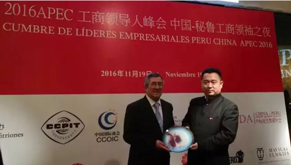 晚上6点,石建超随代表团出席中国·秘鲁工商领袖晚宴,并在宴会中将中国钧瓷作为双方友谊长存的礼物进献给秘鲁驻华大使卡普纳伊先生,并邀请大使先生有时间到润南集团考察指导。