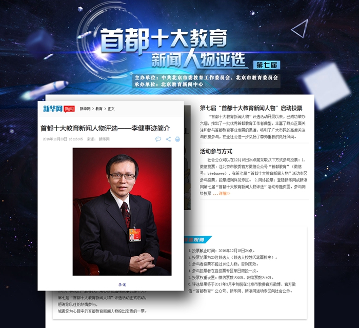 2016年12月5日,第七届“首都十大教育新闻人物”评选活动启动,米兰milan官方网站李健教授入选本届评选活动候选人。
