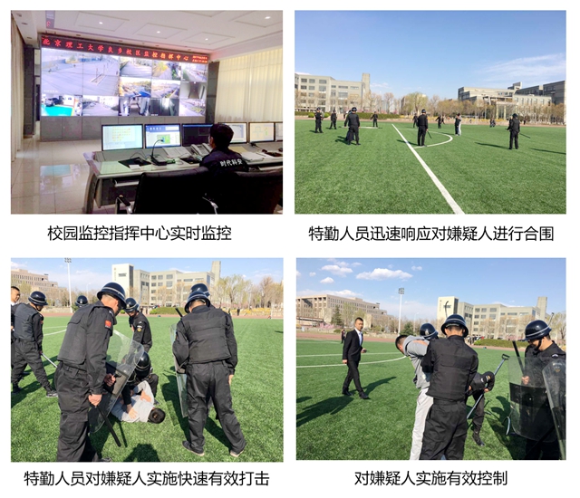 反恐防暴应急演练采用实景模拟形式,从校园巡逻人员发现可疑人员进行盘问开始,到嫌疑人挟持一名学生试图逃离,通过启动校园反恐防爆预案和联动机制,迅速通过监控技术手段监视嫌疑人动向,校区安全特勤人员迅速抵达现场,采用可控有效手段对嫌疑人进行打击,直至完成有效控制。整个演练程序完备、准备充分、一气呵成。