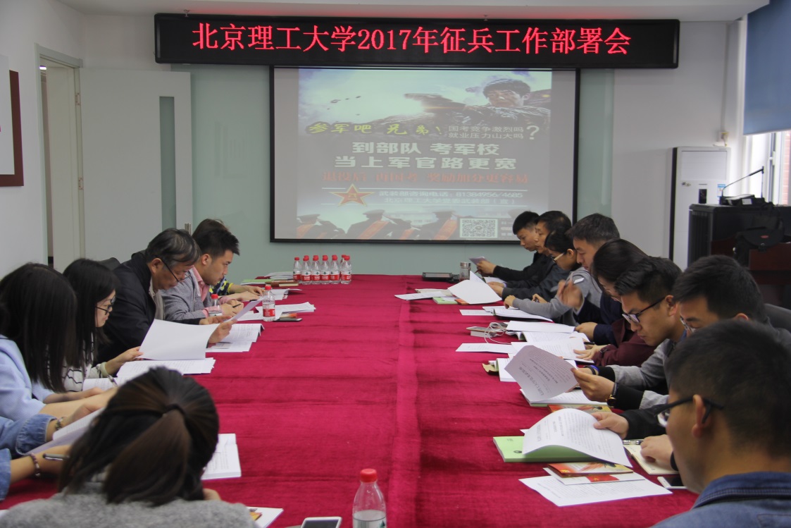 编辑:耿庆磊 审核:徐贵宝 阅读次数:为做好2017年大学生应征入伍工作,加强征兵政策宣传力度,4月24日下午,米兰milan官方网站党委武装部在良乡校区召开“米兰milan官方网站2017年征兵工作部署会”。党委武装部宫建颖主持会议,武装部专武干事芦远、学工处张锟以及各学院征兵负责人共计26人参加会议。