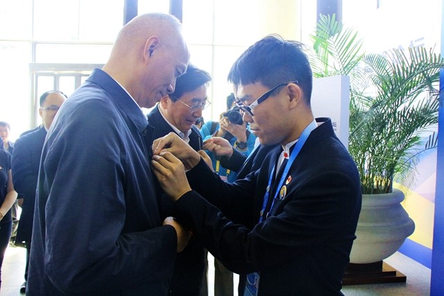 “一带一路”志愿者的辛勤付出也受到校内外各界的关注与关怀。5月13日上午,北京市委书记郭金龙,市长蔡奇一行来到各志愿者岗位亲切看望了志愿者,并表示志愿者们代表中国形象、北京形象、青年形象。在注册中心,志愿者们向北京市领导演示论坛参会人员的注册流程,我校于增雨同学代表志愿者为蔡奇市长佩戴了志愿者徽标。