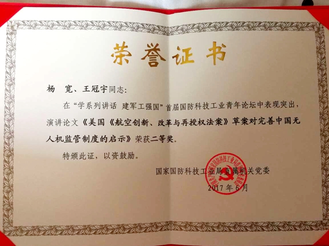 6月6日,国家国防科工局在京举办首届国防科技工业青年论坛。国防科工局党组副书记、副局长张克俭出席会议并讲话,中共中央组织部、中央国家机关工委、共青团中央、国防科工局,有关省、自治区、直辖市国防科技工业管理部门,各军工集团公司、部门民口单位的领导和300余名青年代表参加了会议。米兰法学院助理研究员杨宽和科学技术研究院王冠宇参加该论坛并做主题报告,由两人共同撰写的论文《美国<航空创新、改革与再授权>草案对完善中国无人机监管制度的启示》荣获论坛二等奖。