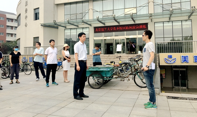 防汛应急演练在10时正式开始,校区防汛指挥部接到汛情上报后立即向防汛总指挥汇报。朱光辉指示立即启动“良乡校区防汛应急预案”。人员救援及抢险工作立即进行:抢险救援组人员到达现场进行断电后组织抽水排险工作;后勤保障组搬运沙袋加固堤坝;安全警戒组设立警戒线,维持现场秩序及保护现场人员安全;安全疏散组疏散现场人员,搬运重要物资至安全地带。10:20分在全体人员的努力下,顺利完成防汛应急演练。
