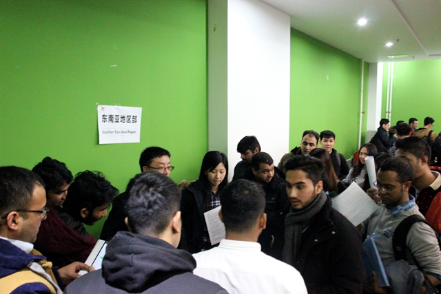 招聘会第二部分是分区域收取简历并解答问题,留学生们表现十分踊跃。现场分为东南亚地区部、中东地区部、南非地区部及其它区域。留学生们都手持自己精心准备好的自荐书和简历,积极与华为公司招聘人员进行交流。