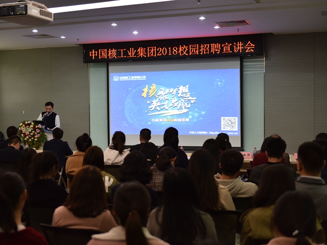 招聘会开始前,中国核工业集团在唯实报告厅举行了招聘宣讲会,介绍了集团及下属单位的基本情况及相关招聘需求。中国核工业集团为我校2018届毕业生提供需求岗位近2000个,涉及机械工程、光学工程、电气工程及自动化、计算机科学与技术、软件工程、会计学、工商管理、法学、外语等专业。