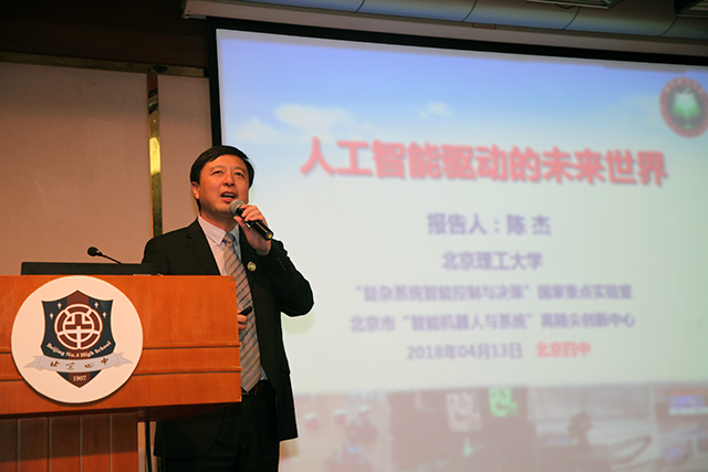 4月13日下午,“北理讲堂——院士进中学”系列学科讲座活动走进北京市第四中学,米兰milan官方网站副校长陈杰院士为逾300位师生作了题为《人工智能驱动的未来世界》的专题报告。北京市第四中学校长马景林出席了活动。