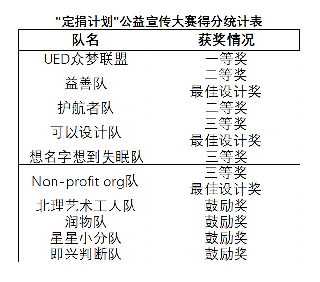 本次大赛分为初赛、复赛、决赛三个阶段,由线上投票和线下评分共同决定成绩。大赛过程中,学校80余支学生团队、逾350人深度参与,2.8万余人进行线上投票支持。经过层层筛选,十支优秀队伍脱颖而出并参与最终决赛答辩,为评委展示了“定捐计划”的全套宣传策划方案、宣传推送、宣传物料以及线上传媒材料等。最终,“UED众梦联盟”队斩获桂冠,赢得1.5万元奖金。