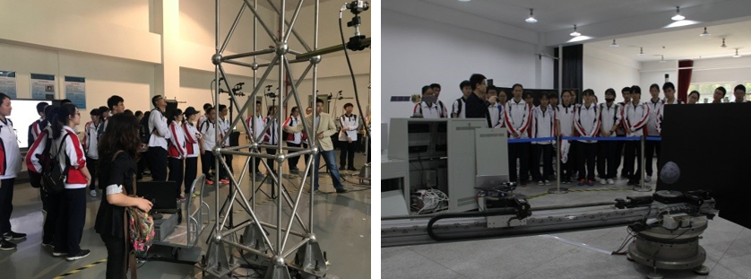 为了让同学们更加直观的了解宇航学院的学科特色,拉近科研与同学之间的距离,讲座结束后,来访师生分为三组,分别到学院无人飞行器自主控制研究所、深空探测技术研究所及空间结构动力学与控制研究所实地参观交流。在空间结构动力学与控制研究所的交流活动中,同学们现场观看了大型可展开空间结构的展开试验,同时我校教师讲解了大型可展开空间结构的应用需求和技术挑战,并详细的回答了同学们提出的问题。