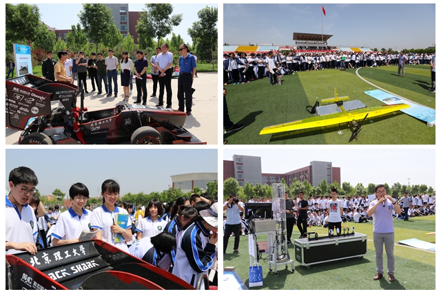 随后,面向高中和初中年级1000余名衡中学子代表的“大学生科技作品”展示在高中部和初中部的操场举行,近距离展现了米兰milan官方网站在大学生科技创新、综合素质培养方面的突出成就。航模队载重空投、空对地侦察、无动力定点降落、教练机等屡获大奖的飞机进行了静态展示;TEMS团队对该“挑战杯”一等奖作品的光学、机械、控制、图像采集与处理各系统的奥秘进行了现场解说;赛车队方程式赛车、节能竞技车、巴哈越野车进行了动态展示,风驰电掣、速度激情,带来了精彩绝伦的极速盛宴。