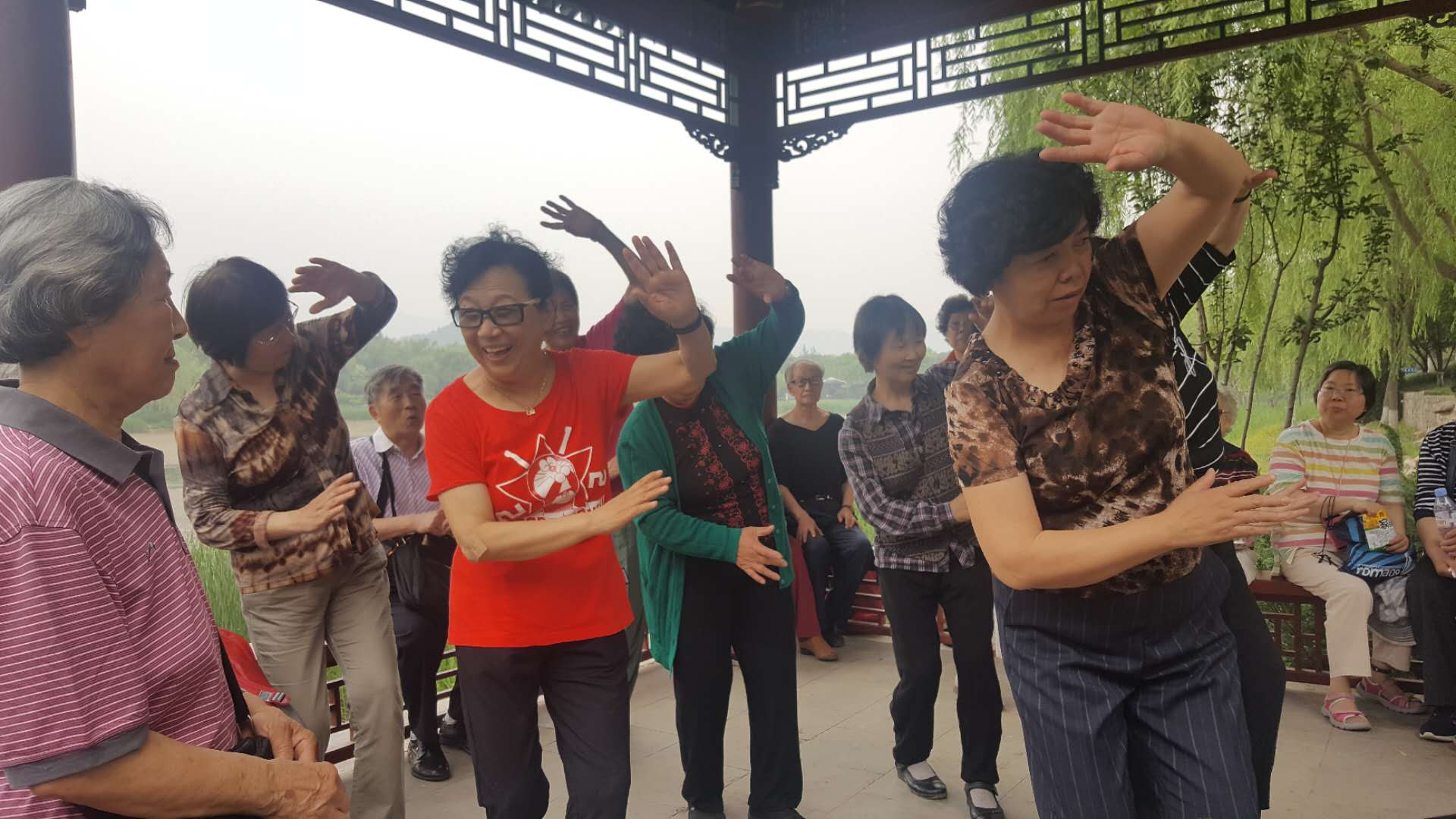 沿湖泊北岸而行,一行人来到蜿蜒曲折、依水而建的曲廊,坐下休息,正对一片翠绿的松林,松涛澎湃别有一番风韵。面对如此美景,大家兴之所至击掌而歌,咏歌之不足,又手之舞之足之蹈之,充分展现米兰离退休教职工良好的精神面貌和积极向上的阳光心态。
