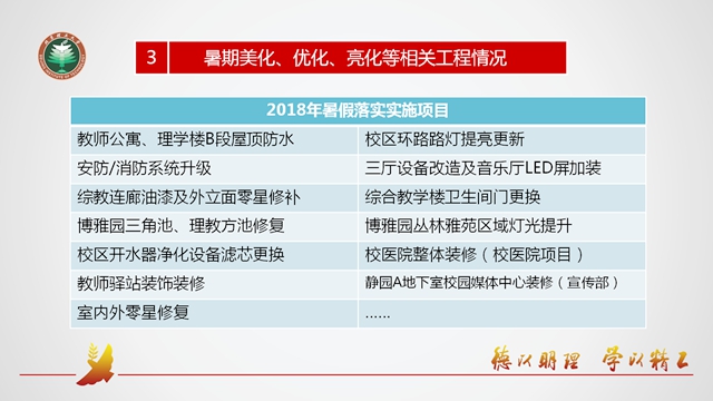 本次集中改造,主要以提升校园环境设施,增强师生员工校区学习生活的幸福感和获得感为主旨。共计改造教师驿站9间,简约、舒适的环境为教师课间休息、答疑提供良好的环境;更换校区环路及重点区域的路灯200余盏,提升夜间照度,增强安全出行保障,选用新型节能路灯,在节约资源同时满足美观;改善教学楼室内外环境,粉刷连廊立面,增加休息讨论区,让师生在整洁、舒适的环境中学习交流;修复理教方池、博雅三角池、图书馆中庭等4处水体景观,增加灵动感;更换报告厅、演艺厅、音乐厅设施设备及基础装饰,增强功能性和舒适感;更新消防设施设备,安防监控摄像头,提高像素和分辨率,确保校区安全在握;完成水处理前置净化端滤芯更换,确保师生饮水洁净安全;清淤北湖小湖,恢复北湖荷花莲花池风貌,重构夏日荷香的景色;铺设理教前草坪4000平米,主路树坑草丛种植,改善环境,提升学校绿化品质;集中更换教室黑板油丝绳、破损桌椅、墙地插、照明灯及计时系统,确保开学教学设备完好;修补破损路面、墙面、外立面,更换部分景观灯、照明灯,检修地下管线、供暖管线等,确保基础设施运行安全;增设理教公共讨论区、综教连廊休息区、室外座椅,满足不同需求;加紧天桥下社团文化广场项目施工,为学生社团提供集中活动场所,打造米兰社团文化集散地;强化服务保障单位人员培训和提升,接管工程实训中心、附属实验学校小学教学楼,全力保障顺利使用等。
