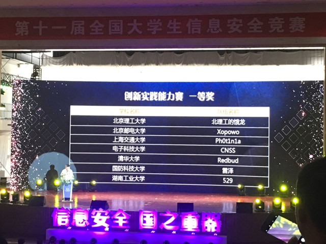 7月29日,第十一届全国大学生信息安全竞赛在武汉大学落下帷幕。由我校计算机学院副院长祝烈煌带队,张子剑、沈蒙、王安、徐畅、礼欣指导的参赛队伍再次取得佳绩,共获“创新实践能力赛”(以下简称“创新赛”)一等奖、网络安全创新单项奖;“信息安全作品赛”(以下简称“作品赛”)二等奖3项、三等奖2项。