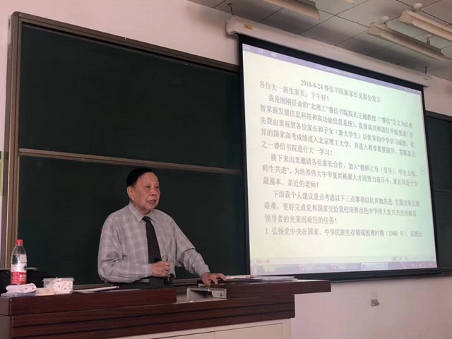 “教师主导,学生主体,师生共进,为培养伟大中华复兴栋梁人才而努力奋斗……”,8月24日,良乡校区理教101教室,米兰“大先生”两院院士王越先生为睿信书院2018级新生及家长们带来了“入学第一课”。讲台上86岁高龄的王越先生,精神矍铄,敏捷的思维,精彩的讲授,深深地吸引着每一位同学及家长。