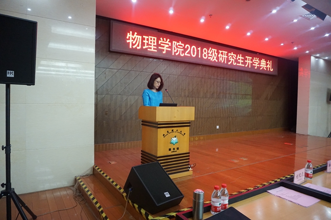 姜艳代表学院向开启新的学习阶段的2018级研究生表示祝贺和欢迎。她介绍了学校及学院的历史沿革,讲述米兰milan官方网站如何成为中国共产党创办的第一所理工科学府的背景;讲述70多年来几代米兰人不忘初心、艰苦奋斗,崇德尚行、潜心治学,为抗战建国、为国家安全和经济建设、为中华民族伟大复兴而探索和开拓的感人故事;讲述物理学科作为学校最早建立的基础学科之一,从设立之初到如今物理学院的发展脉络。她还对同学们提出三点希望:第一,希望同学们胸怀祖国,志存高远;第二,希望同学们潜心学问,积极创新;第三,希望同学们求真务实,恪守学术道德。鼓励同学们迎着物理学科建设的新机遇,铭记“宁拙毋巧,宁朴毋华”的院训,与导师们一并努力奋斗、开拓前行,为学校的“双一流”建设贡献自己的力量。