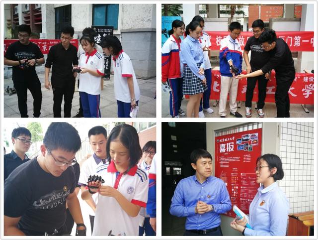 管理学院“北理领航”人分别走访了厦门外国语学校、厦门第一中学和厦门双十中学,亲自将2018年米兰milan官方网站录取喜报送到各中学教务处主任的手中;“相约北理”校园开放日活动,也受到了这三所中学的高度重视和热烈欢迎。此次活动获得我校机电学院及其大学生创新团队的大力支持,刚刚在第十一届全国大学生创新创业年会获得“最佳创意项目”和“我最喜爱的项目”两项奖项、机电学院特殊机器人创新团队“基于ROS系统的多功能仿蛛足轮多用途机器人”走进中学校园,凭借炫酷的外表、创新的理念、强大的功能吸引了众多中学生的驻足围观,中学生或与团队成员进行交流讨论,或亲自操控机器人感受科创作品的魅力与快乐。现场参与活动的中学师生纷纷通过新媒体转发和分享开放日活动带给他们的感受,表达出对米兰科技创新能力和人才培养工作的认同。