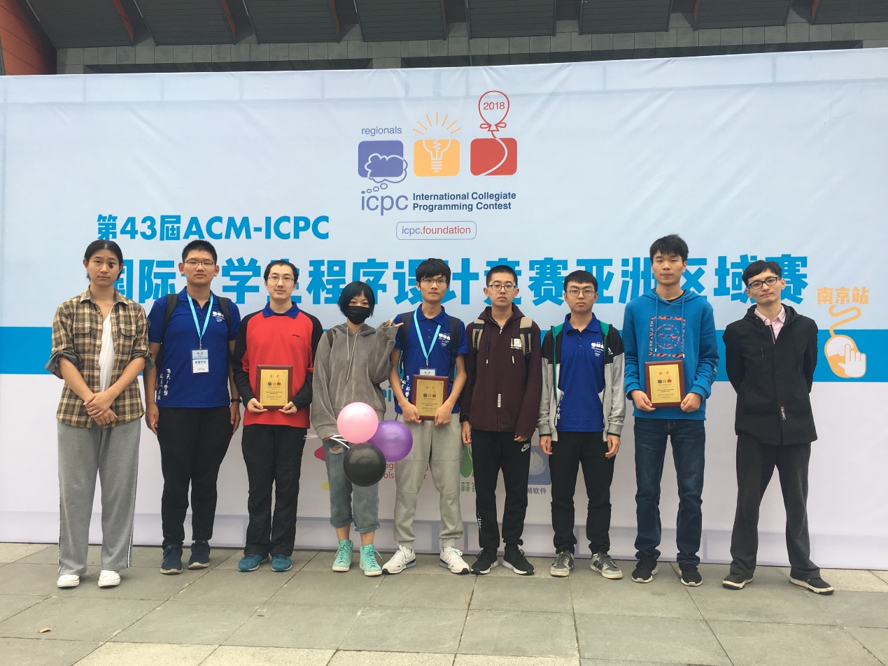 南京站的比赛由南京航空航天大学承办,共有来自清华大学、上海交通大学、复旦大学、南京大学等上百余高校的327支队伍参赛。经过激烈角逐,最终,来自我校计算机学院的“乖乖站好”队获得金牌 。竞赛中,“乖乖站好”队克服了前期发挥不佳的不利形势,奋勇直追,表现神勇,在封榜阶段接连通过三题,最终以七题通过的成绩赢得了一块金牌,这也是本年度我校学生参与ACM竞赛取得的第一块金牌。“摸鱼肥宅”队与“1e9+7” 队最终分别以通过五题和六题的成绩夺得两块银牌。