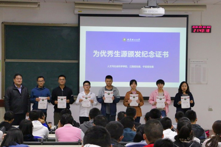 “北理领航人”代表还为全体新生颁发了招生组制作的“优秀生源”纪念证书。招生组建立专门微信群以加强与新生的交流和跟踪,便于更好的推动学校招生宣传政策的实施及“思源计划”的实施。 招生组也将继续创新工作,不断搭建沟通交流平台,提升生源质量,统筹落实学校“北理领航人”及“北理讲堂”制度,吸引更多优质生源。