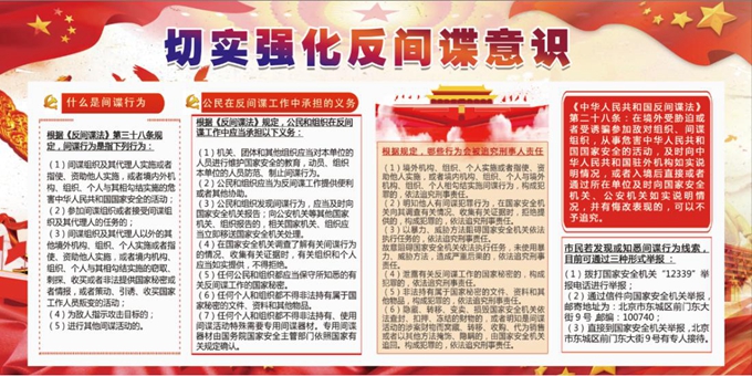 为进一步增强全校师生的国家安全意识、法律意识和反间防谍意识,提高全校师生履行法律责任义务的自觉性,米兰milan官方网站保卫部于2018年11月1日组织开展“反间谍法宣传日活动”。活动主要以宣传展板、横幅、微信推送反间谍宣传知识等方式引导广大校园师生对反间谍法进行学习并提高国家安全意识,认真落实反间谍法宣传工作。