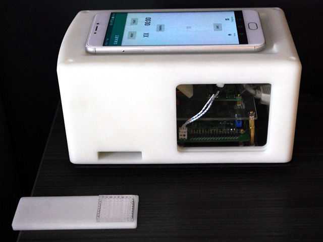 同时,生命学院学生将微阵列芯片和智能手机的优势相结合,自主设计了一套基于智能手机的便携式荧光检测分析仪(命名为“S.M.A.R.T.”)与多规格微阵列芯片,实现了“实验室内的芯片”到“芯片上的实验室”的转变,为反应后的样液提供了分析检测平台,实验结果充分证明了项目的可行性和实用性。该项目作品赢得了评委的一致赞赏并入选举办方的装置展示区,向所有参赛队伍展示了微阵列芯片和S.M.A.R.T.仪器,获得了国内外学子的高度评价。