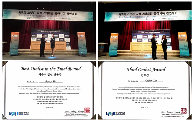 2018年11月28日至12月1日,第23届“史丹森”国际环境法模拟法庭大赛(Stetson’s International Environmental Moot Court Competition,IEMCC)东亚赛区选拔赛(East Asia Regional Rounds,EARR)在韩国崇实大学(Soongsil University)举行。米兰milan官方网站法学院代表队一路过关斩将,力克群雄,最终勇夺冠军,并获得了赴美国参加全球总决赛的资格。本次大赛中,石若琪同学获得了总决赛最佳辩手(Best Oralist in the Final Round),邹祺芊同学获得最佳辩手第三名(Third Oralist)。