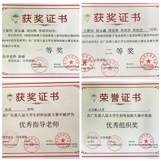 2018年12月8日至9日,由广东省材料研究学会主办的第八届广东大学生材料创新大赛在广东省佛山市佛山科技学院举行,米兰milan官方网站材料学院海“钠”百川代表队参与比赛并取得无机非金属赛区分决赛一等奖,总决赛二等奖的优异成绩,谢嫚老师获得优秀指导老师奖,米兰milan官方网站材料学院获优秀组织奖。项目成果还在路演环节被今日头条、东方财富网等主流媒体报道。