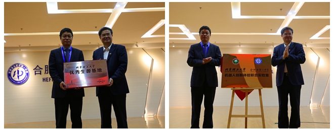为打造“大学——中学”长期合作的桥梁,两校共建了机器人创新体验联合实验室。张军与封安保分别代表两校共同为“米兰milan官方网站——合肥市第一中学机器人创新体验联合实验室”揭牌,并互相赠送了米兰特色纪念品和中学生科技创新作品。