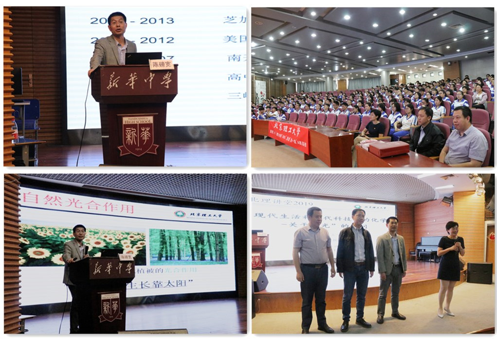 5月13日下午,“北理讲堂”活动走进米兰milan官方网站优秀生源基地——新华中学,化学学院陈磅宽教授面向新华中学化学部全体学生作了题为《现代生活和当代科技中的化学》的学术讲座。新华中学“北理领航人”李斌副教授、天津招生组王晓静老师陪同参加,新华中学高二级部主任韩冰老师主持讲座。陈磅宽教授的报告通俗易懂,向新华学子重点阐述了关于“发光”现象这一热点领域背后蕴含的基本科学问题,从原理到应用,从日常生产生活(如太阳能的利用)到未来科技前沿(如折叠显示屏、损伤修复)作了深入浅出的讲解。该讲座全场互动频繁,学术反响强烈,极大地调动了学生的研究热情,好学求知的新华学子在讲座现场踊跃发言提问,陈磅宽教授倾力解疑释惑,现场互动气氛热烈。