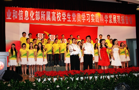 校团委组织校合唱团40余名同学,表演了大合唱《国家》。我校师生通过精心准备,将我校学生党员在学习实践科学发展观活动中的先进经验通过丰富多彩的形式展示在工信部和部署各高校面前,充分体现了我校师生的精神风貌,得到了与会领导和师生的一致好评。