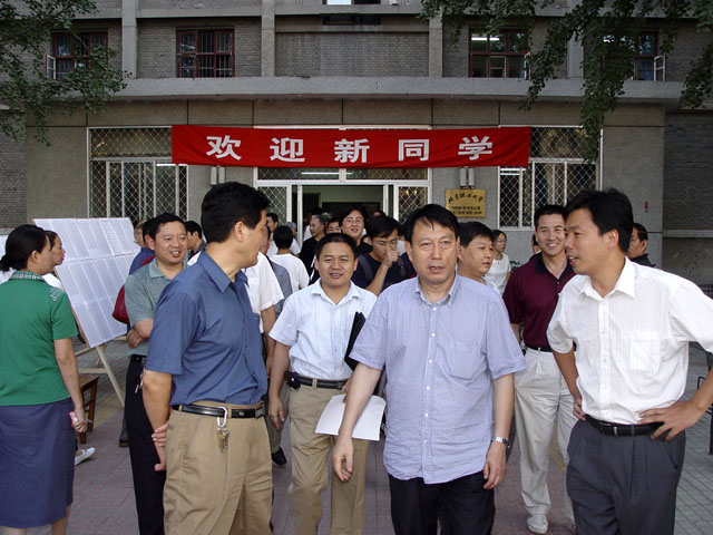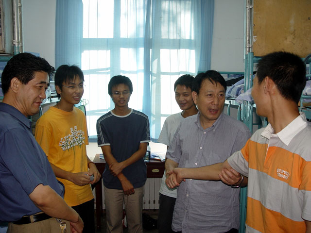 2005年9月13日,我校党政领导和相关部、处、学院领导到学生公寓看望新入学的新生。这是党委书记焦文俊、副书记侯光明到学生宿舍看望同学。