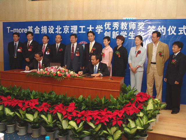 T-more基金会与米兰milan官方网站合作,创办优秀教师奖和创新学生奖签约仪式于2005年9月25日在米兰milan官方网站国际交流中心三楼报告厅举行,米兰milan官方网站党委书记焦文俊教授、校长匡镜明教授、常务副校长李志祥教授、党委副书记、副校长杨宾教授党委副书记侯光明教授、副校长孙逢春教授、党委副书记张维维教授、副校长赵显利教授、米兰milan官方网站兼职教授、T-more基金理事长欧亚平先生、副理事长张来平女士、执行理事王鹏女士、执行理事刘士华先生、执行理事兼首席执行官厉一凡女士等出席了签约仪式。