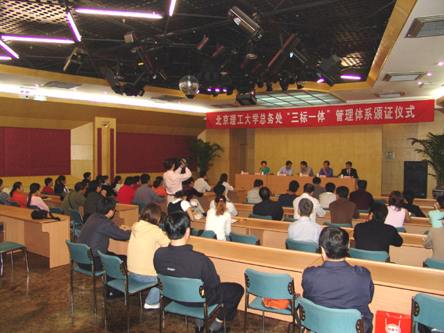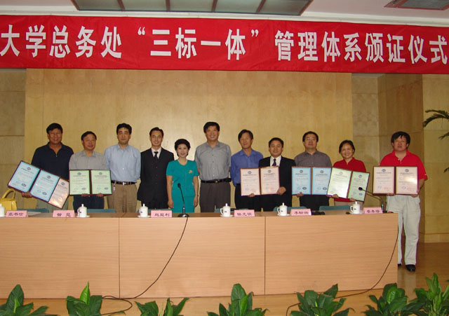 参加仪式的有党委副书记侯光明教授,副校长、工会主席赵显利教授,北京恩格威质量体系认证中心主任曾见,后勤集团党委书记李盼兴,总经理蔡本睿等五十余人。