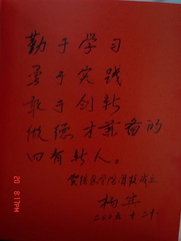 学校党委副书记、副校长杨宾由于出差未能到现场参加大会特意发来贺信并题词祝贺,并委托学生工作处处长刘明奇老师宣读贺信。
