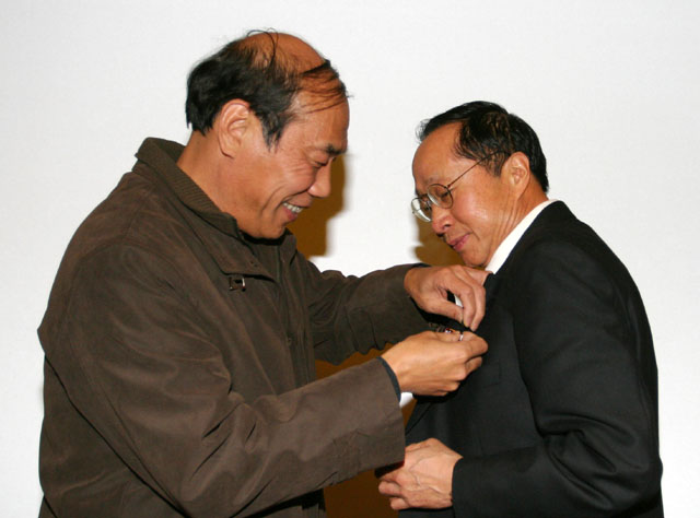 软件学院书记王树武为张瑞昌先生佩戴校徽。